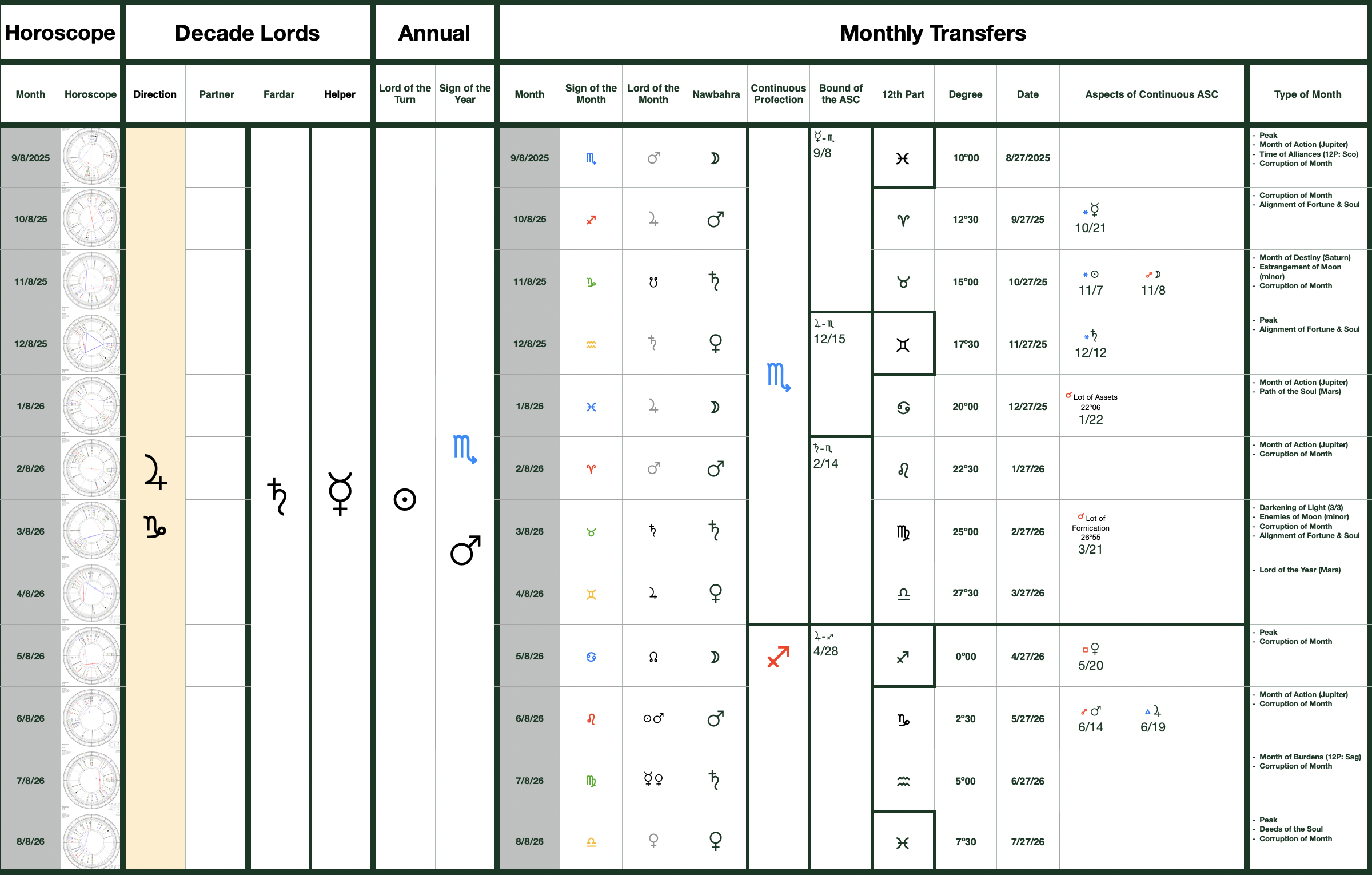 These are examples of what a monthly transfer table would look like using the Medieval Islamicate methods of delineating the year-ahead. We’ll examine the 12 monthly horoscopes alongside these transfers to accurately predict the upcoming events down the the DAY!